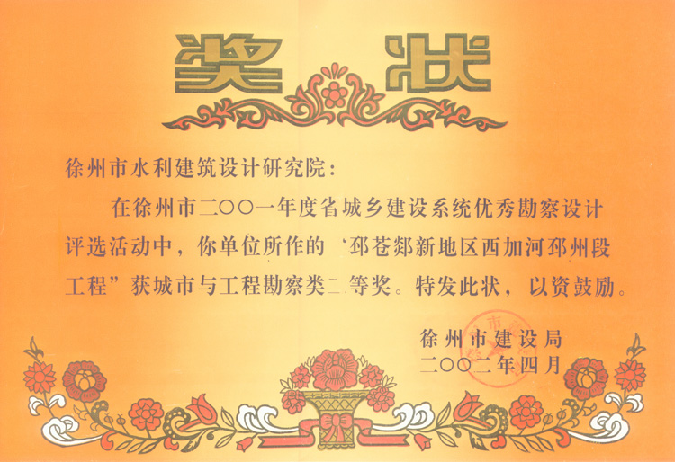 《邳蒼郯新地區(qū)西加河工程》市勘察二等獎(jiǎng)(2002)